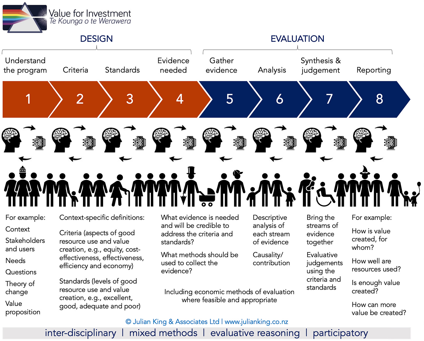 There may be roles for AI to assist at every stage of an evaluation process - e.g., it can help you prepare or respond to terms of reference, navigate contract negotiations, conduct background research, design stakeholder engagement processes, develop a theory of change, value proposition, criteria and standards, identify evidence sources, design data collection tools, clean and code data, analyse and synthesise evidence, compare evidence with criteria and standards to suggest performance ratings, report preparation, and more.