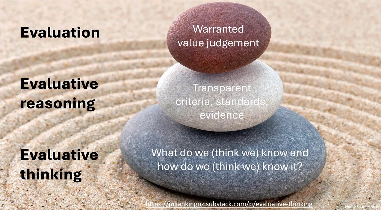 In evaluative thinking we provisionally trust. Bring explicit values, multiple lines of evidence, and a curious mind.