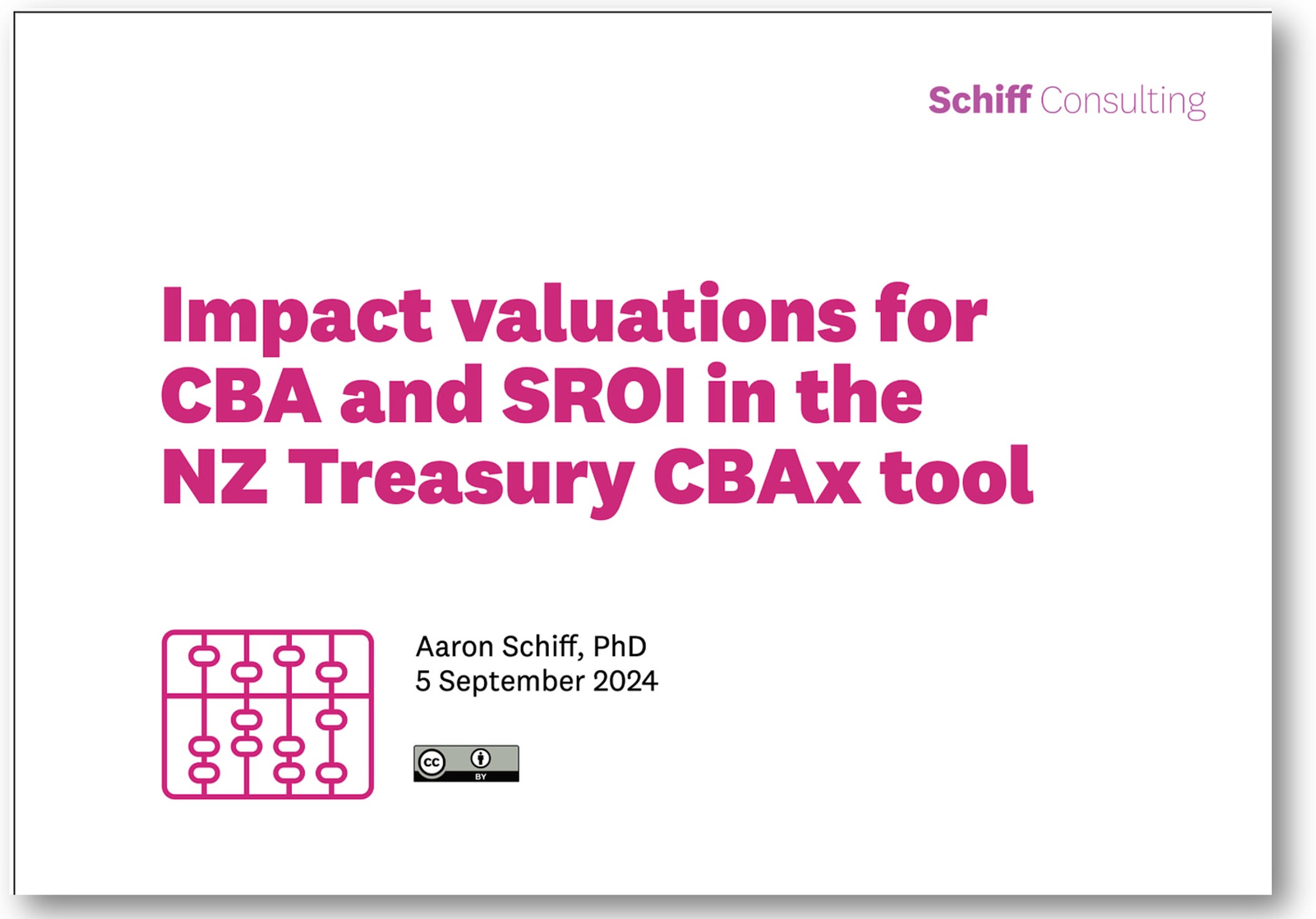 Schiff, A. (2024). Impact valuations for CBA and SROI in the NZ Treasury CBAx tool. Schiff Consulting. https://www.schiff.co.nz/en/resources/impact-valuation/