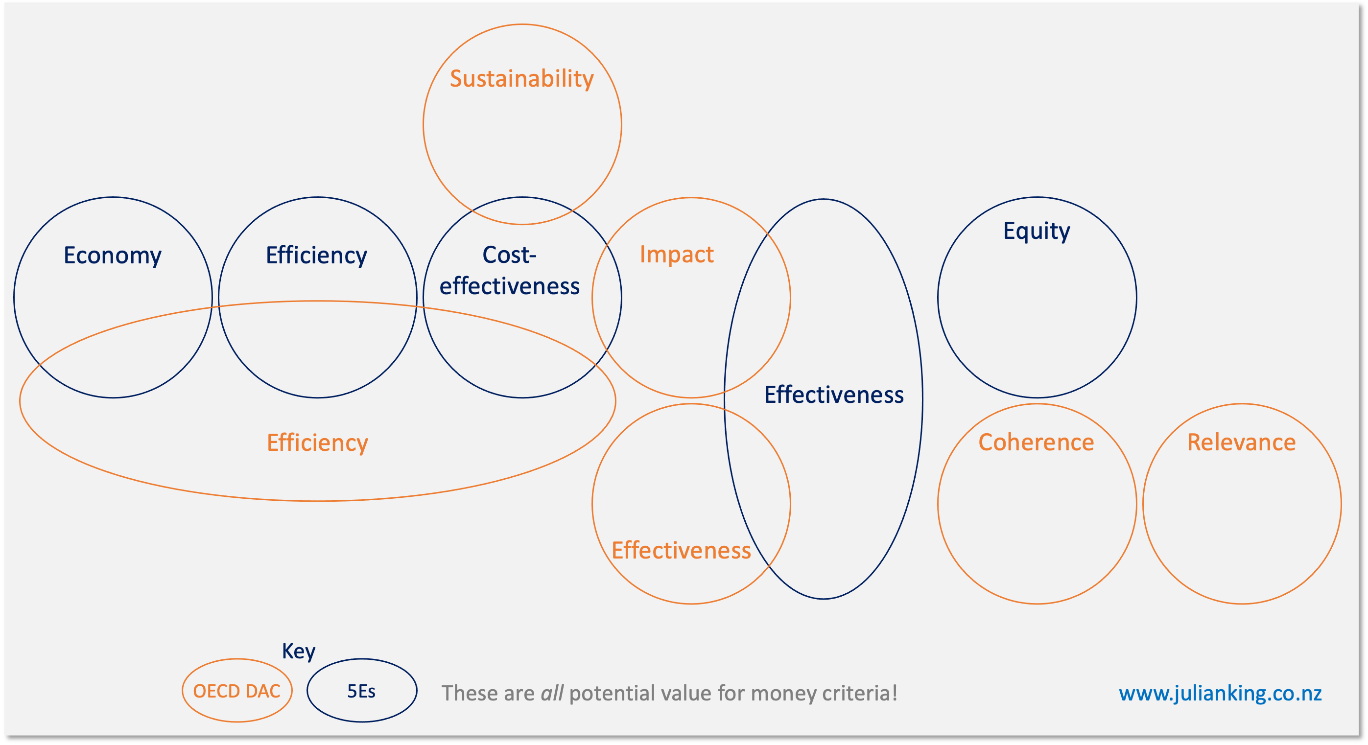 The 5Es are good conversation starters but they're not the full list of potential VfM criteria. If you use the 5Es, they can (and should) be defined in context-specific terms. Over the next few Sundays I'm going to unpack some tips and tricks for doing just that.